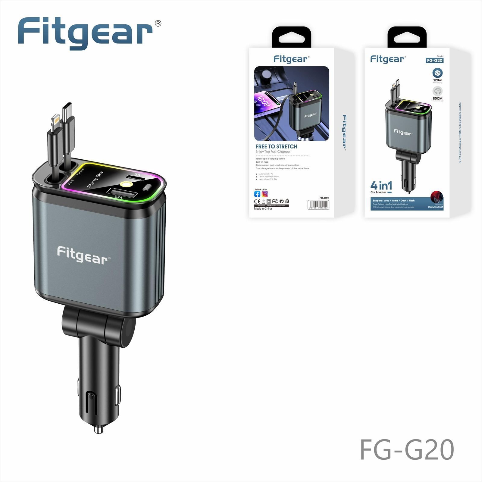 FITGEAR- FG-G20 4 in one car charger🔌 With LED star light 🌟 120 walt %